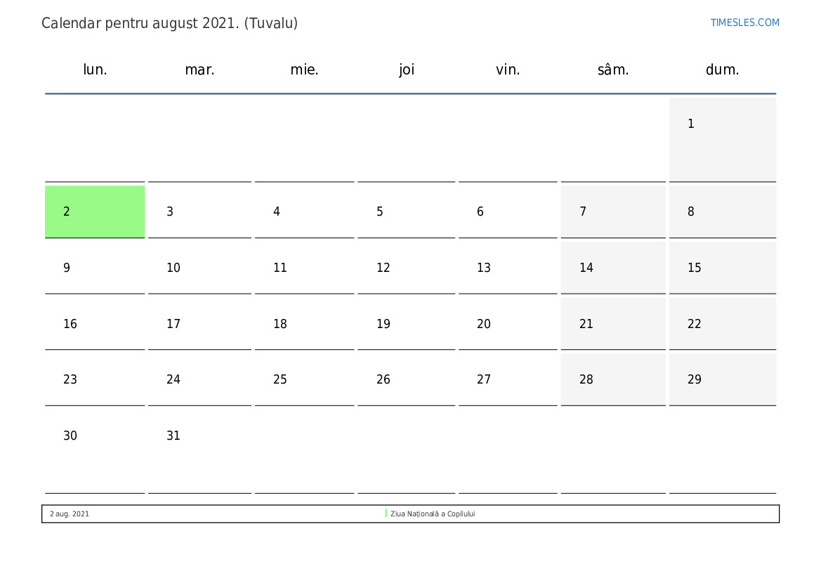 Descărcați și tipăriți calendarul PDF cu sărbătorile și weekendurile pentru august 2021 pentru Tuvalu