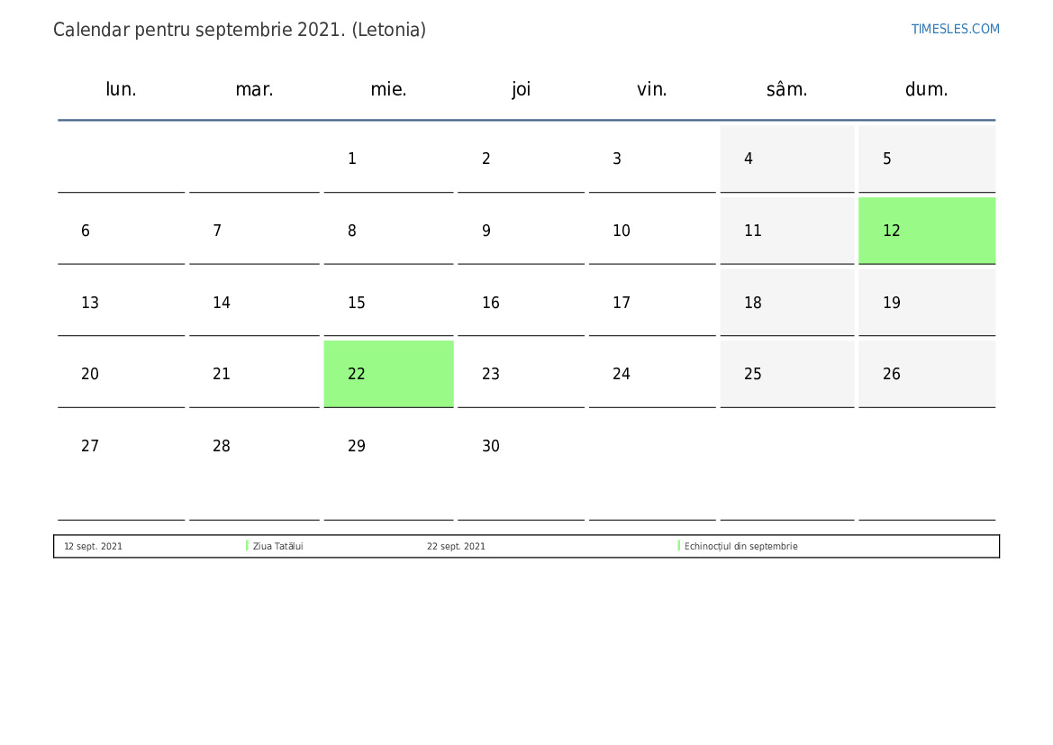 Descărcați și tipăriți calendarul PDF cu sărbătorile și weekendurile pentru septembrie 2021 pentru Letonia