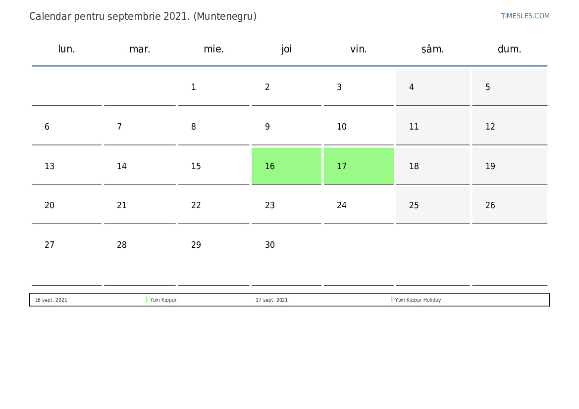 Descărcați și tipăriți calendarul PDF cu sărbătorile și weekendurile pentru septembrie 2021 pentru Muntenegru