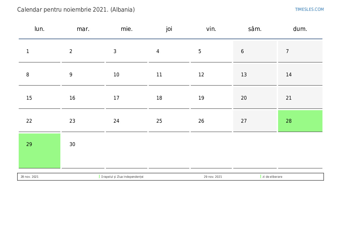 Descărcați și tipăriți calendarul PDF cu sărbătorile și weekendurile pentru noiembrie 2021 pentru Albania