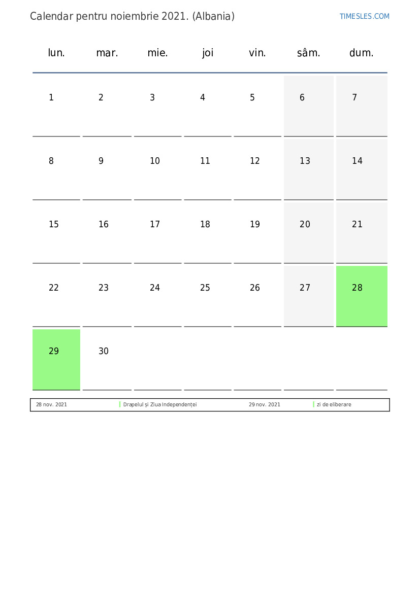 Calendarul sărbătorilor și weekendurilor pentru noiembrie 2021 pentru Albania
