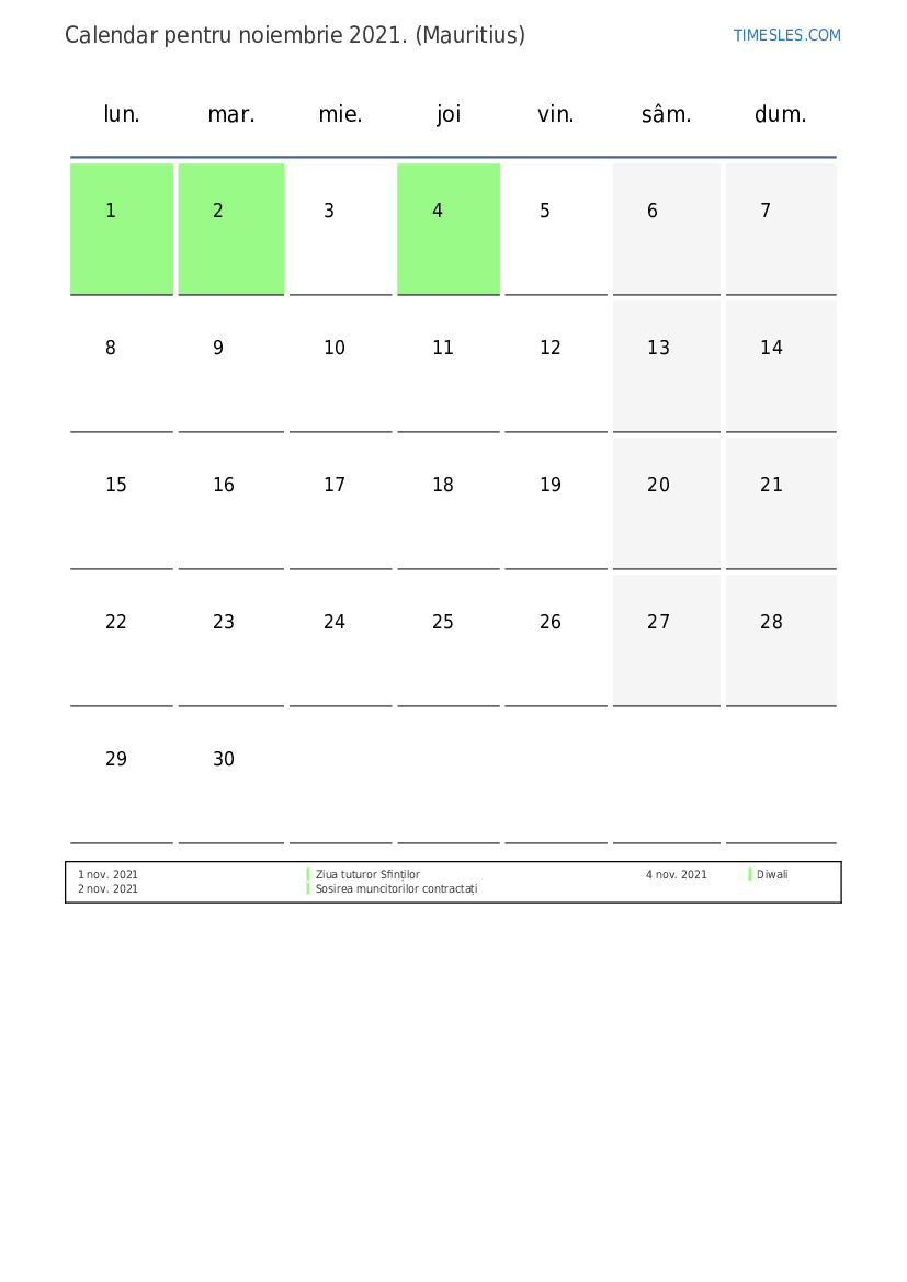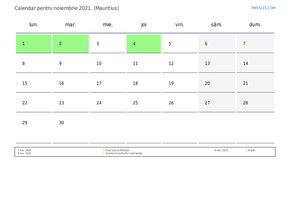 Descărcați și tipăriți calendarul PDF cu sărbătorile și weekendurile pentru noiembrie 2021 pentru Mauritius