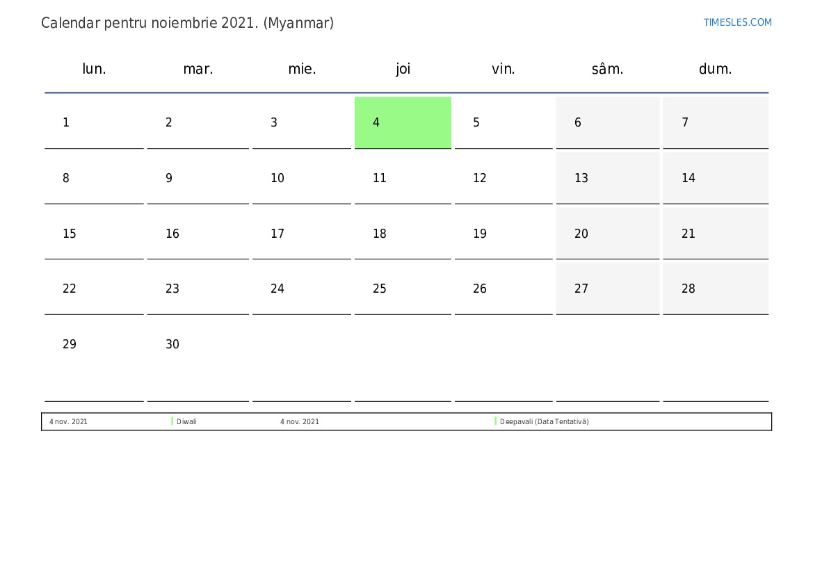Descărcați și tipăriți calendarul PDF cu sărbătorile și weekendurile pentru noiembrie 2021 pentru Myanmar