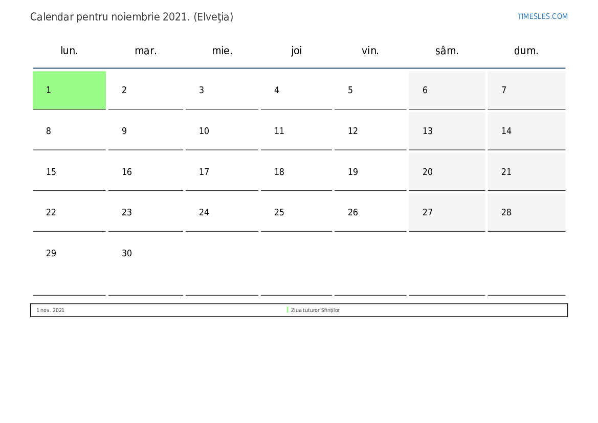 Descărcați și tipăriți calendarul PDF cu sărbătorile și weekendurile pentru noiembrie 2021 pentru Elveția