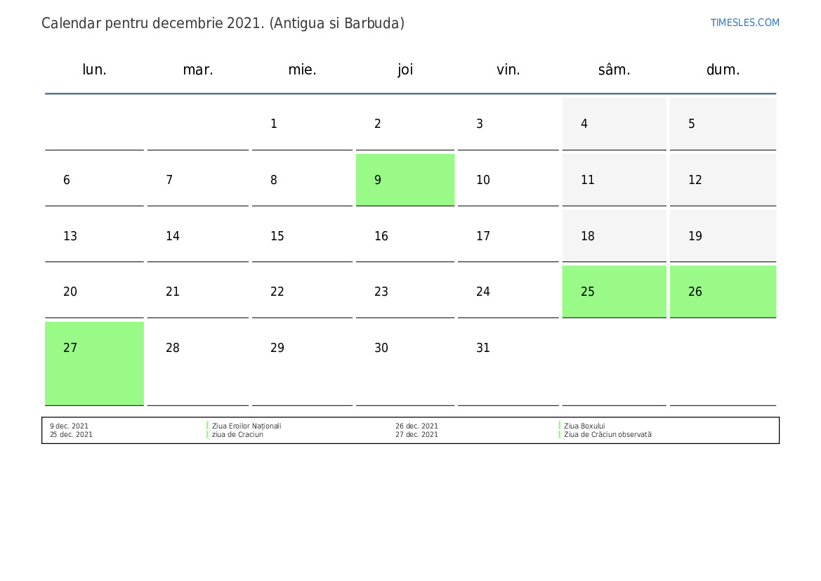 Calendarul decembrie 2021 pentru Antigua și Barbuda