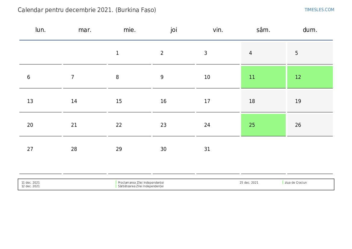 Calendarul sărbătorilor și weekendurilor pentru decembrie 2021 pentru Burkina Faso