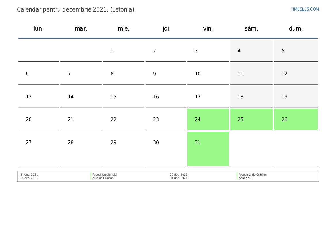 Descărcați și tipăriți calendarul PDF cu sărbătorile și weekendurile pentru decembrie 2021 pentru Letonia