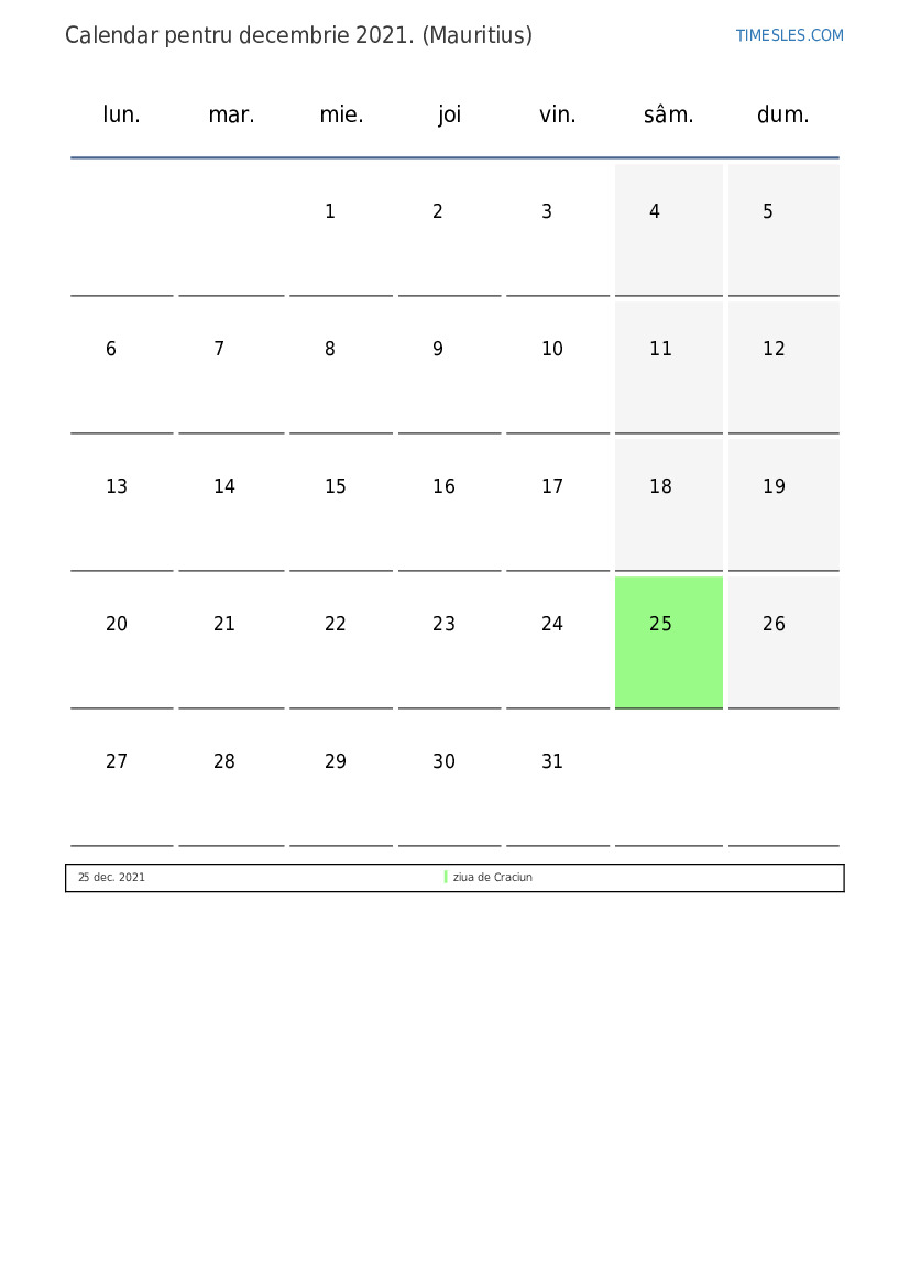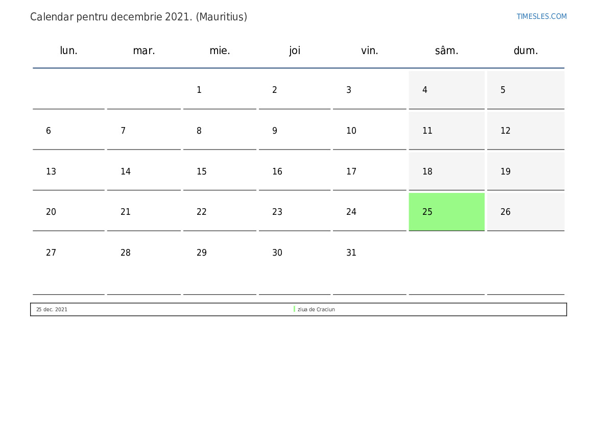 Descărcați și tipăriți calendarul PDF cu sărbătorile și weekendurile pentru decembrie 2021 pentru Mauritius