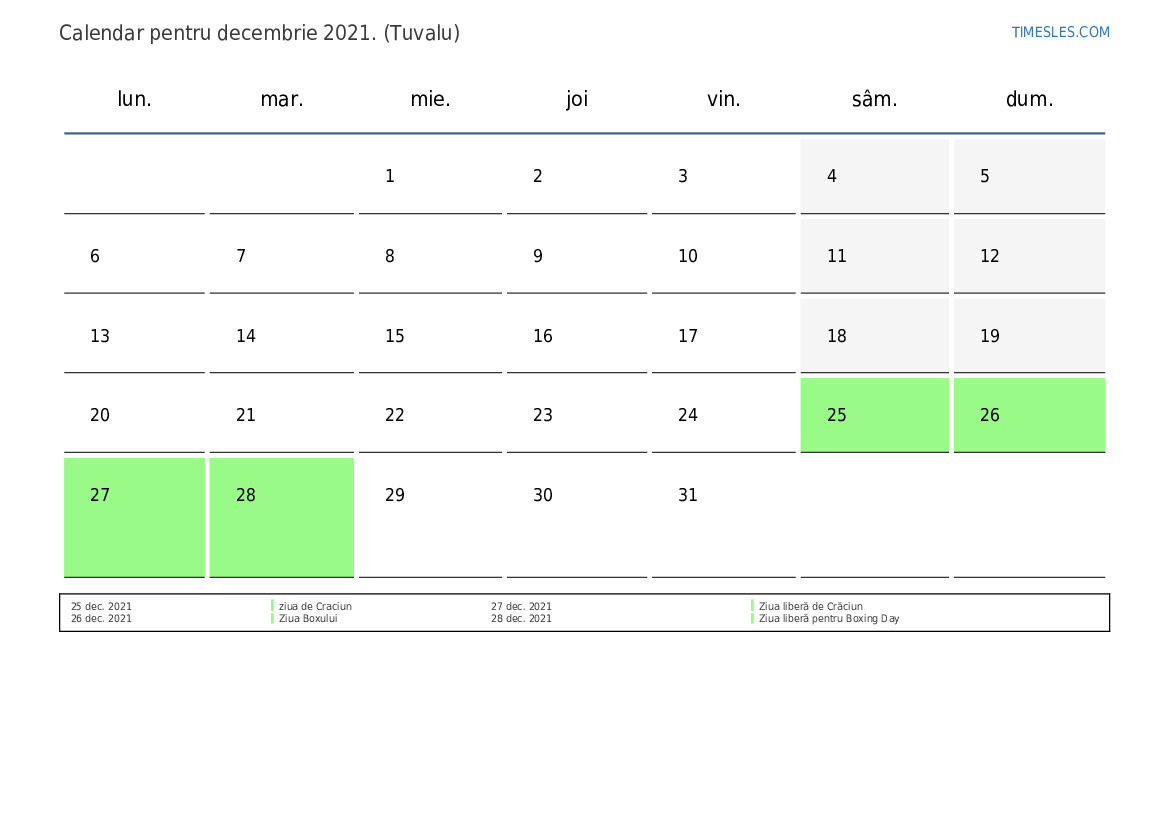 Descărcați și tipăriți calendarul PDF cu sărbătorile și weekendurile pentru decembrie 2021 pentru Tuvalu