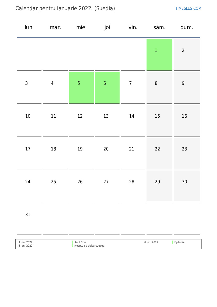 Calendarul sărbătorilor și weekendurilor pentru ianuarie 2022 pentru Suedia
