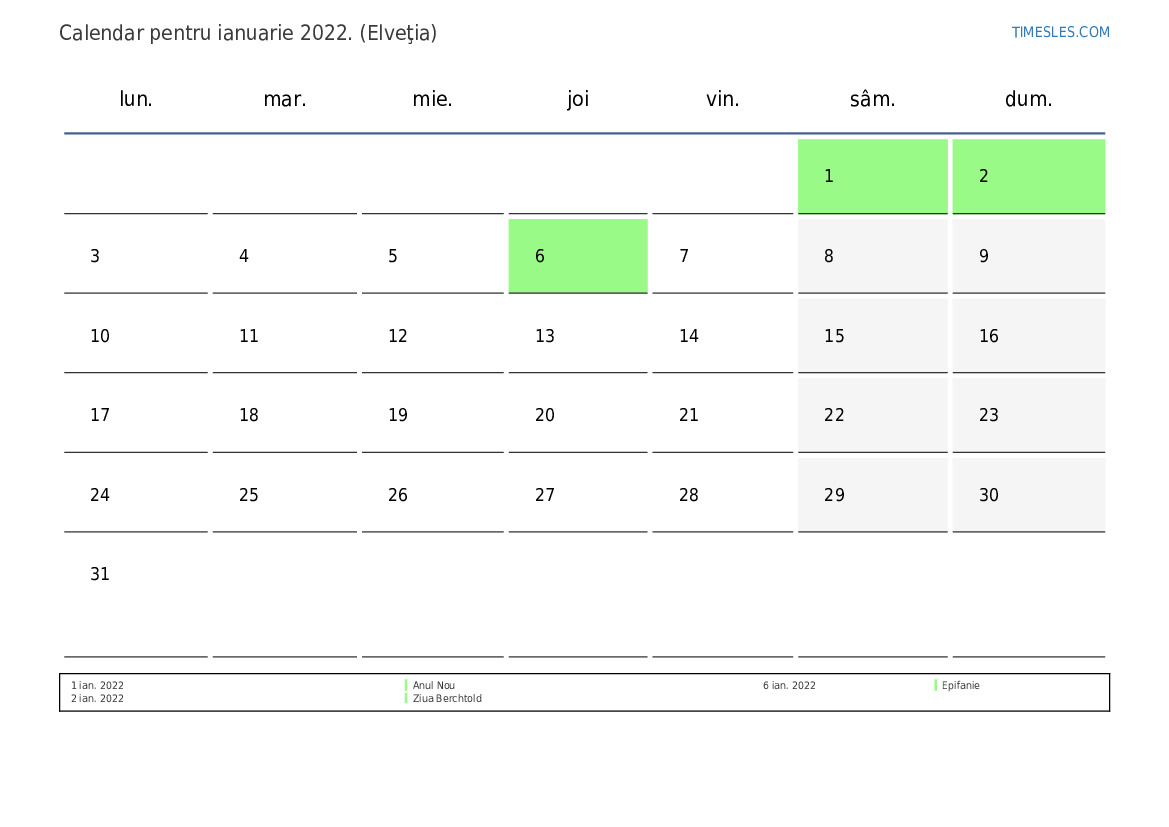 Calendarul sărbătorilor și weekendurilor pentru ianuarie 2022 pentru Elveția