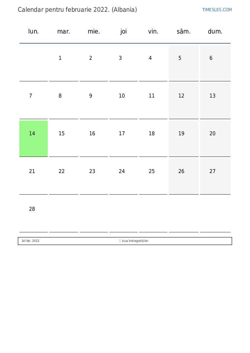 Descărcați și tipăriți calendarul PDF cu sărbătorile și weekendurile pentru februarie 2022 pentru Albania