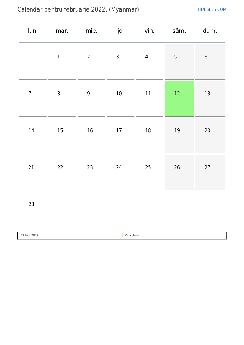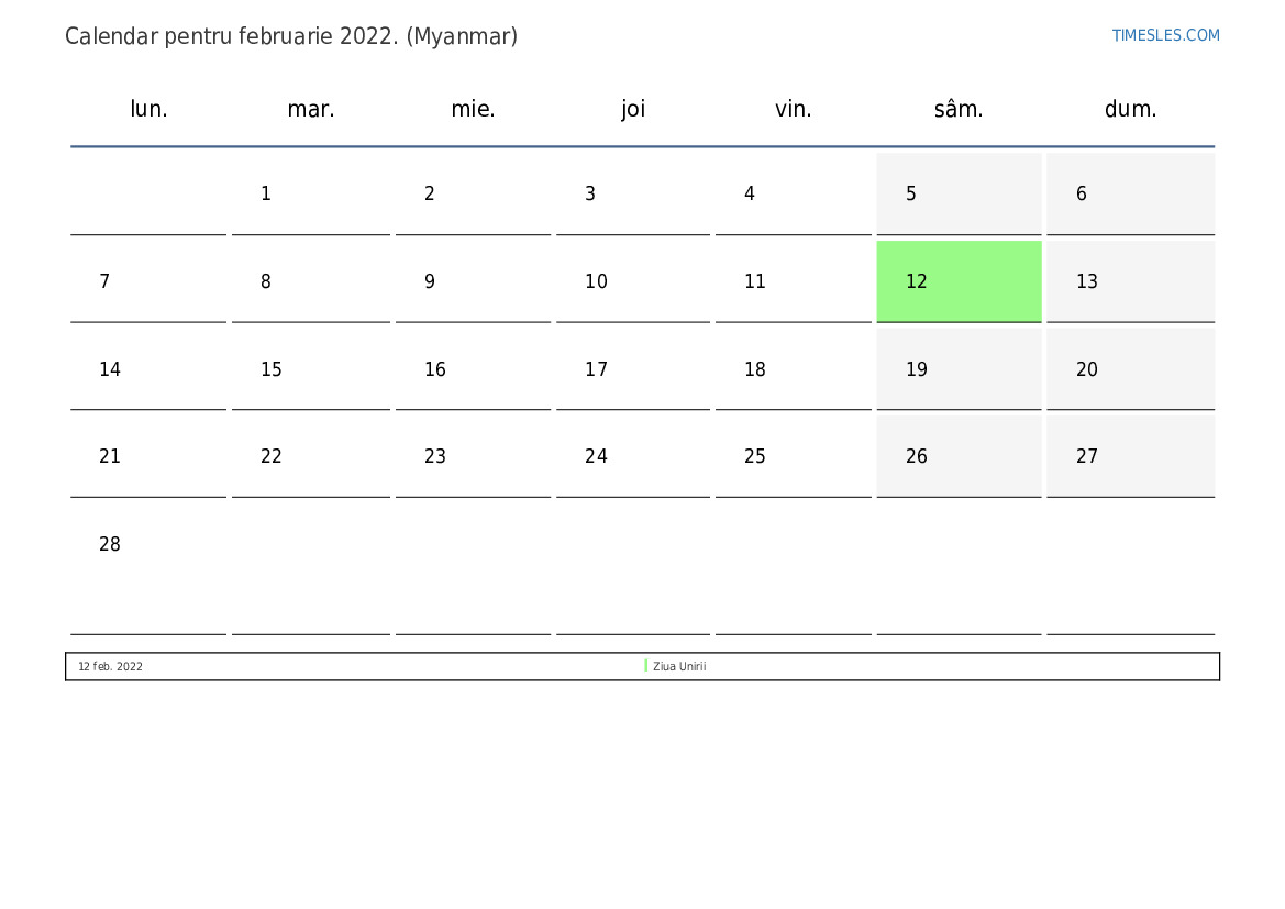 Calendarul sărbătorilor și weekendurilor pentru februarie 2022 pentru Myanmar