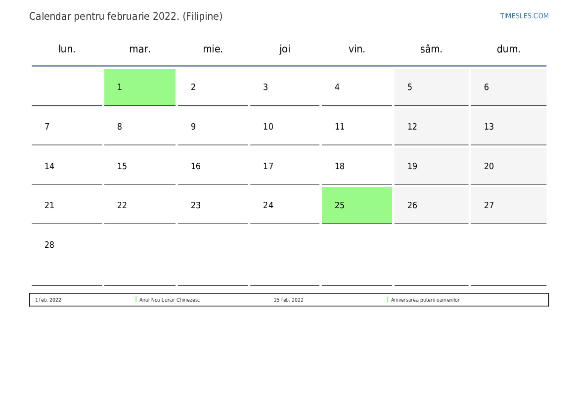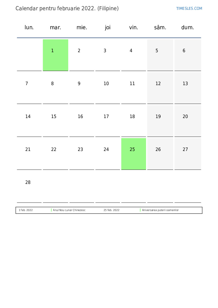 Calendarul sărbătorilor și weekendurilor pentru februarie 2022 pentru Filipine
