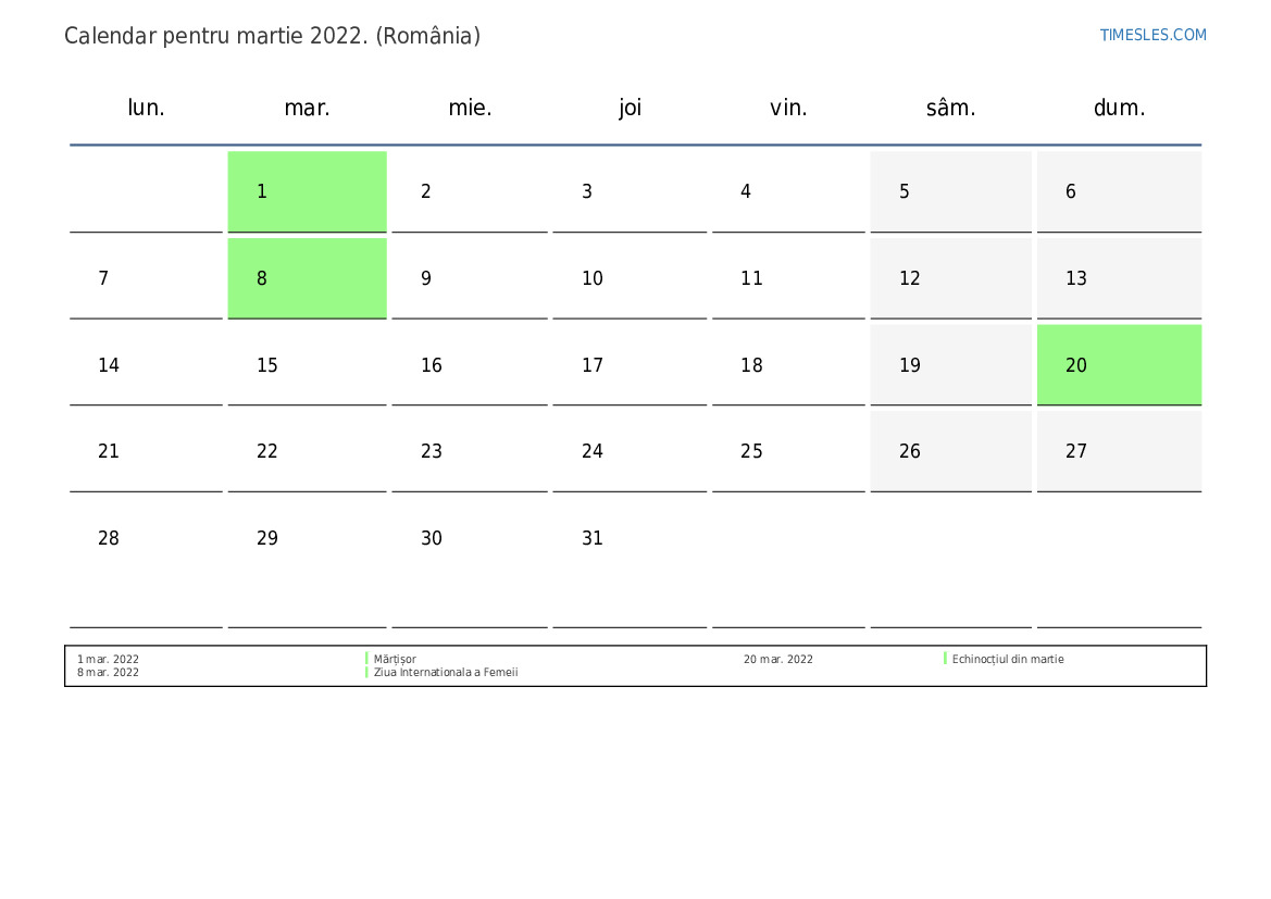 Descărcați și tipăriți calendarul PDF cu sărbătorile și weekendurile pentru martie 2022 pentru România