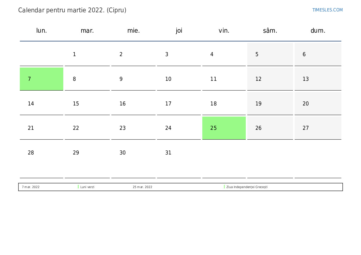 Descărcați și tipăriți calendarul PDF cu sărbătorile și weekendurile pentru martie 2022 pentru Cipru