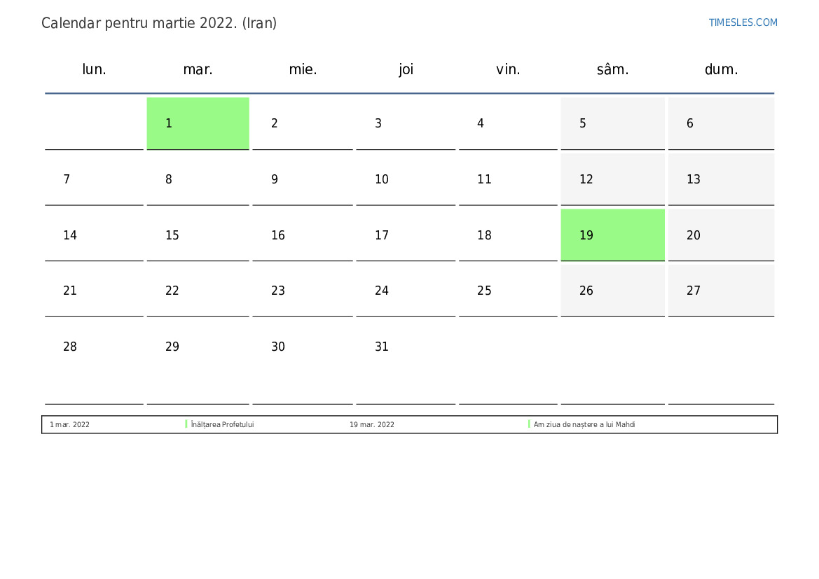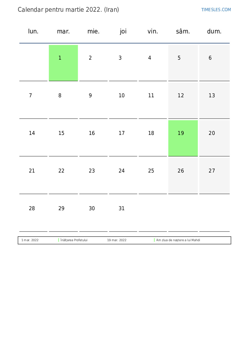 Luna martie conține 31 de zile. Aceasta este 3 lună din 2022. Sezonul anului: arc. Luna martie începe marti și se termină joia. În luna martie 2022, sunt 3 sărbători și zile libere în Iran.