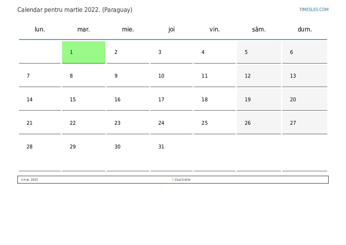 Calendarul sărbătorilor și weekendurilor pentru martie 2022 pentru Paraguay