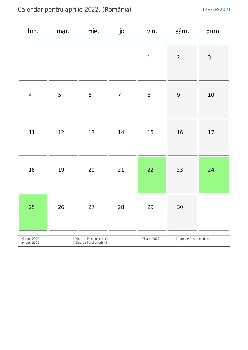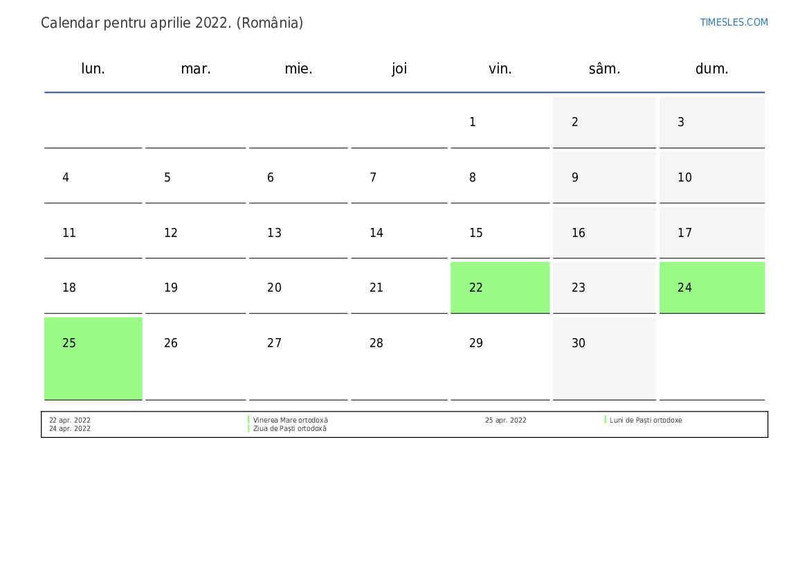 Calendarul aprilie 2022 pentru România