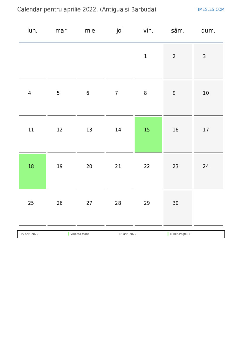 Calendarul aprilie 2022 pentru Antigua și Barbuda