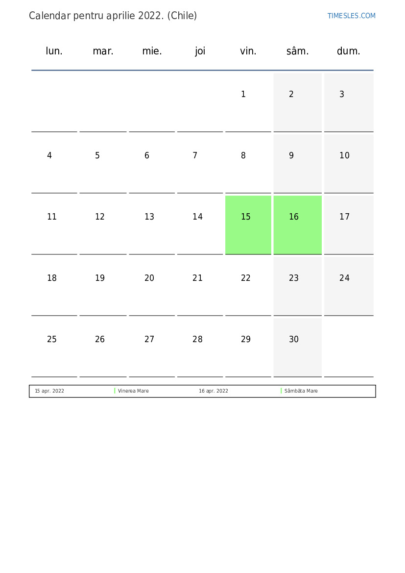 Descărcați și tipăriți calendarul PDF cu sărbătorile și weekendurile pentru aprilie 2022 pentru Chile