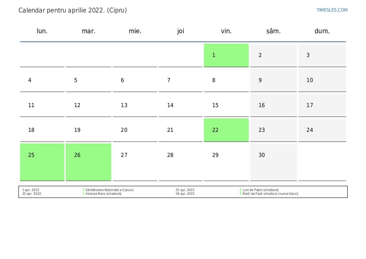 Descărcați și tipăriți calendarul PDF cu sărbătorile și weekendurile pentru aprilie 2022 pentru Cipru