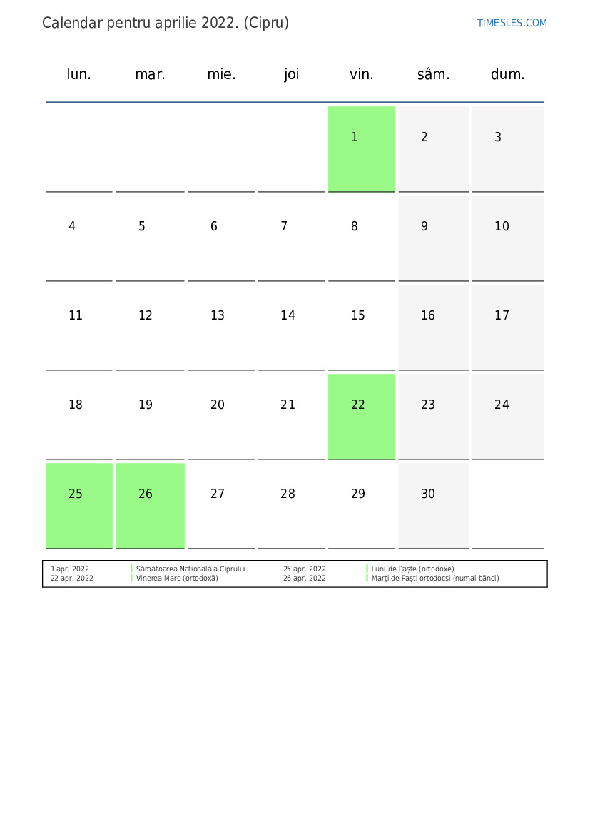 Calendarul sărbătorilor și weekendurilor pentru aprilie 2022 pentru Cipru