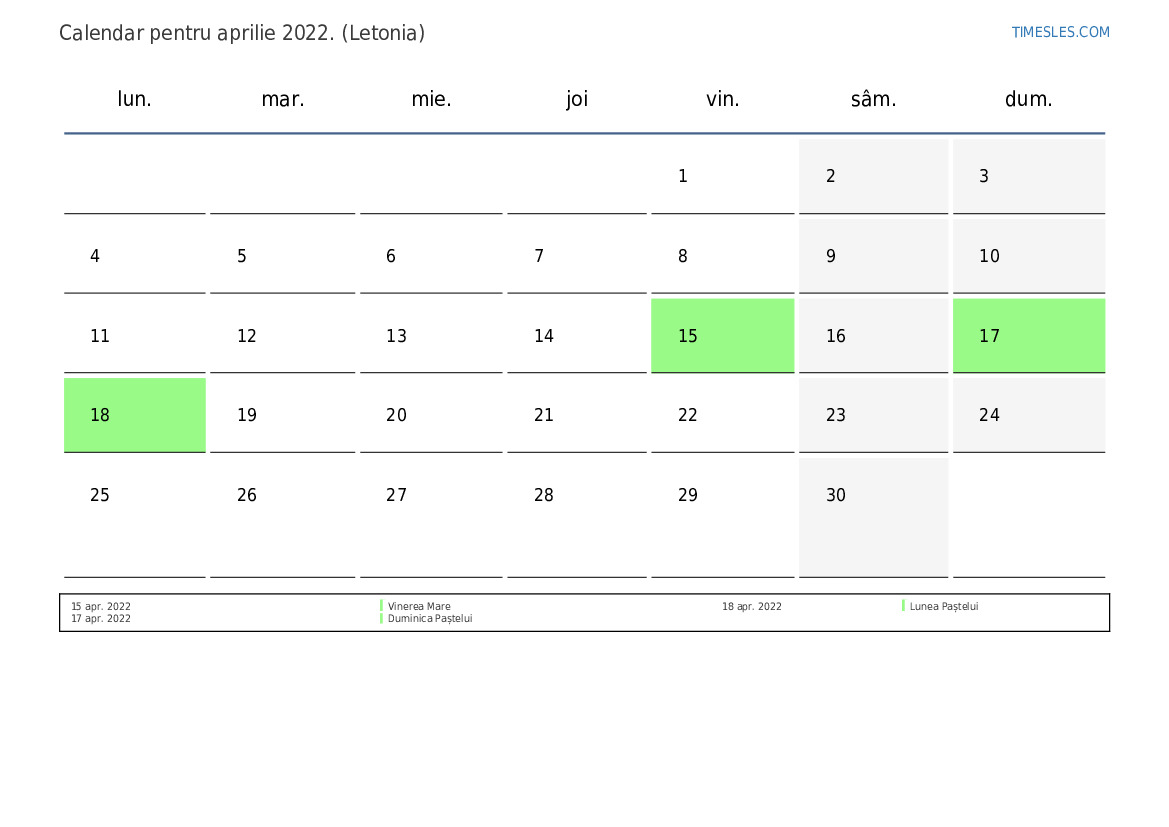 Descărcați și tipăriți calendarul PDF cu sărbătorile și weekendurile pentru aprilie 2022 pentru Letonia