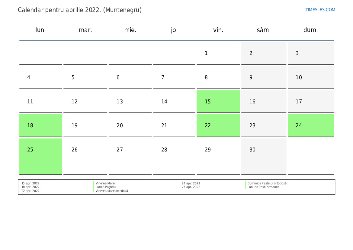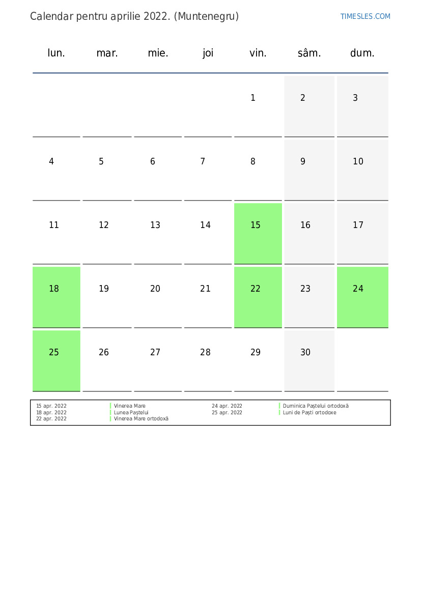 Descărcați și tipăriți calendarul PDF cu sărbătorile și weekendurile pentru aprilie 2022 pentru Muntenegru