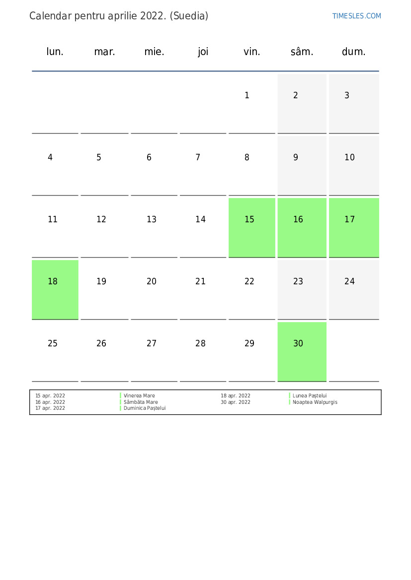 Descărcați și tipăriți calendarul PDF cu sărbătorile și weekendurile pentru aprilie 2022 pentru Suedia