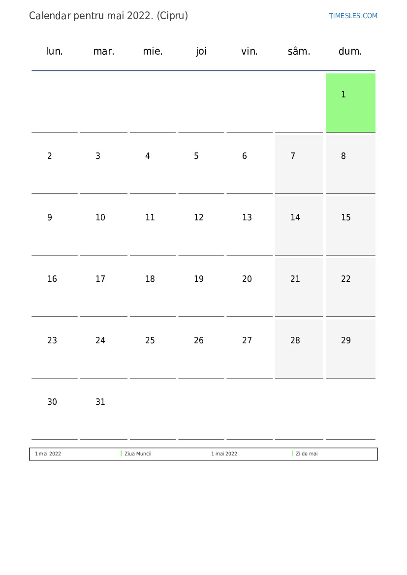 Luna mai conține 31 de zile. Aceasta este 5 lună din 2022. Sezonul anului: arc. Luna mai începe duminică și se termină marti. În luna mai 2022, sunt 2 sărbători și zile libere în Cipru.