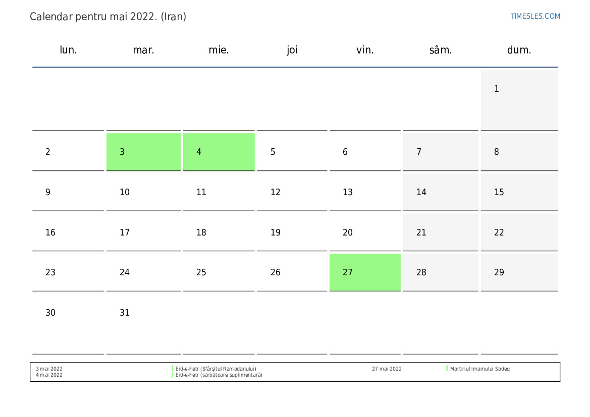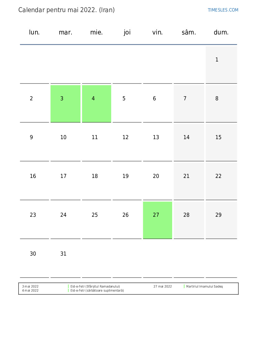 Luna mai conține 31 de zile. Aceasta este 5 lună din 2022. Sezonul anului: arc. Luna mai începe duminică și se termină marti. În luna mai 2022, sunt 3 sărbători și zile libere în Iran.