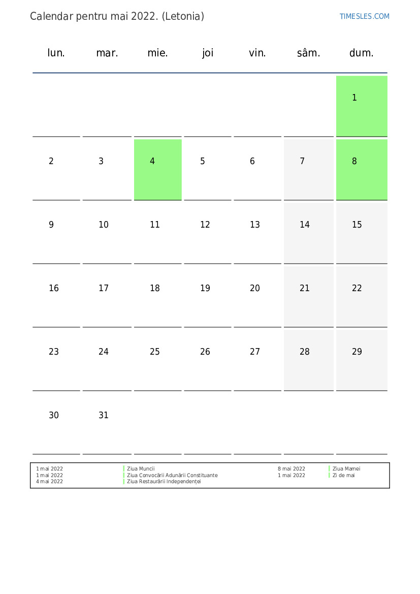Calendarul mai 2022 pentru Letonia