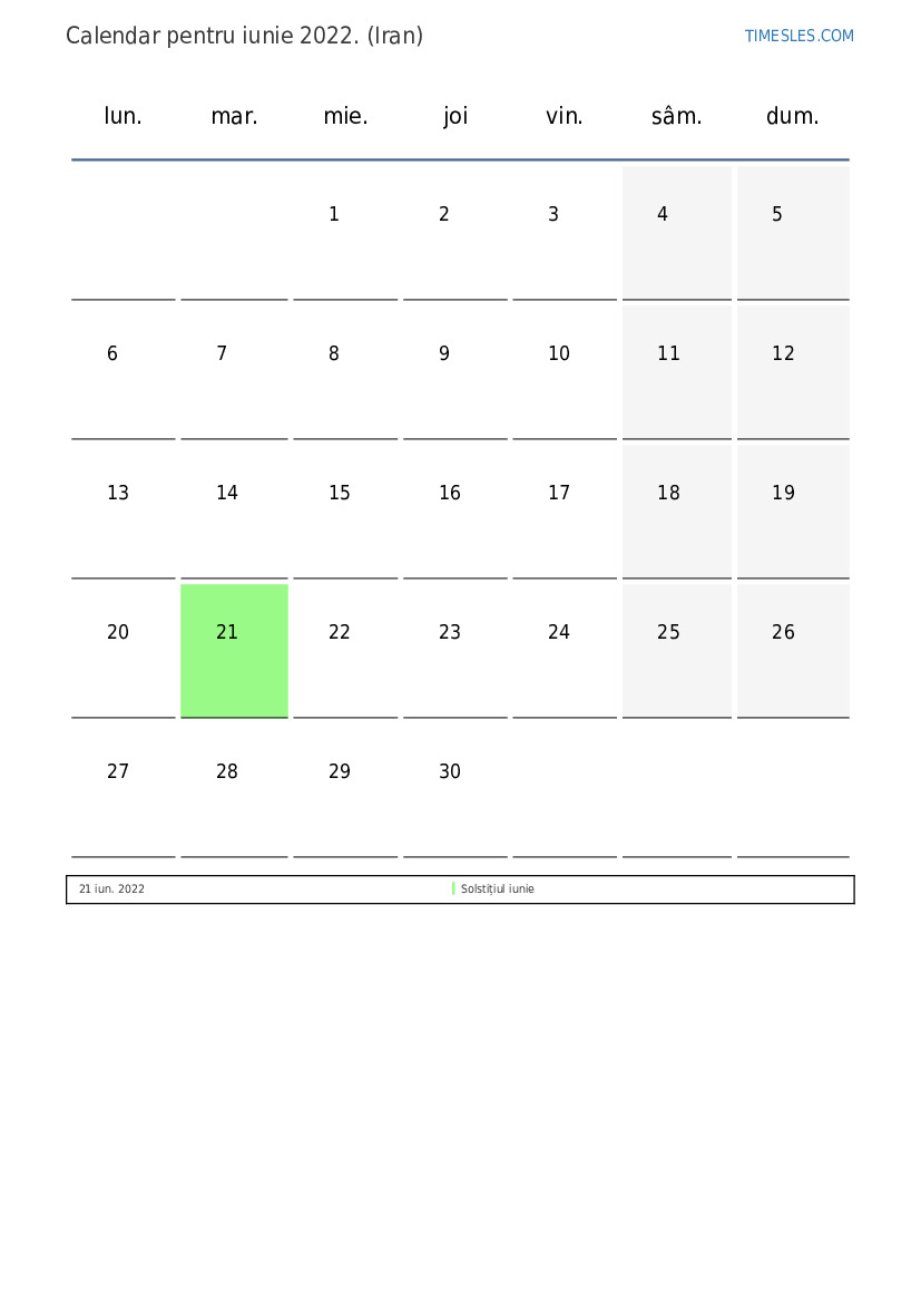 Descărcați și tipăriți calendarul PDF cu sărbătorile și weekendurile pentru iunie 2022 pentru Iran