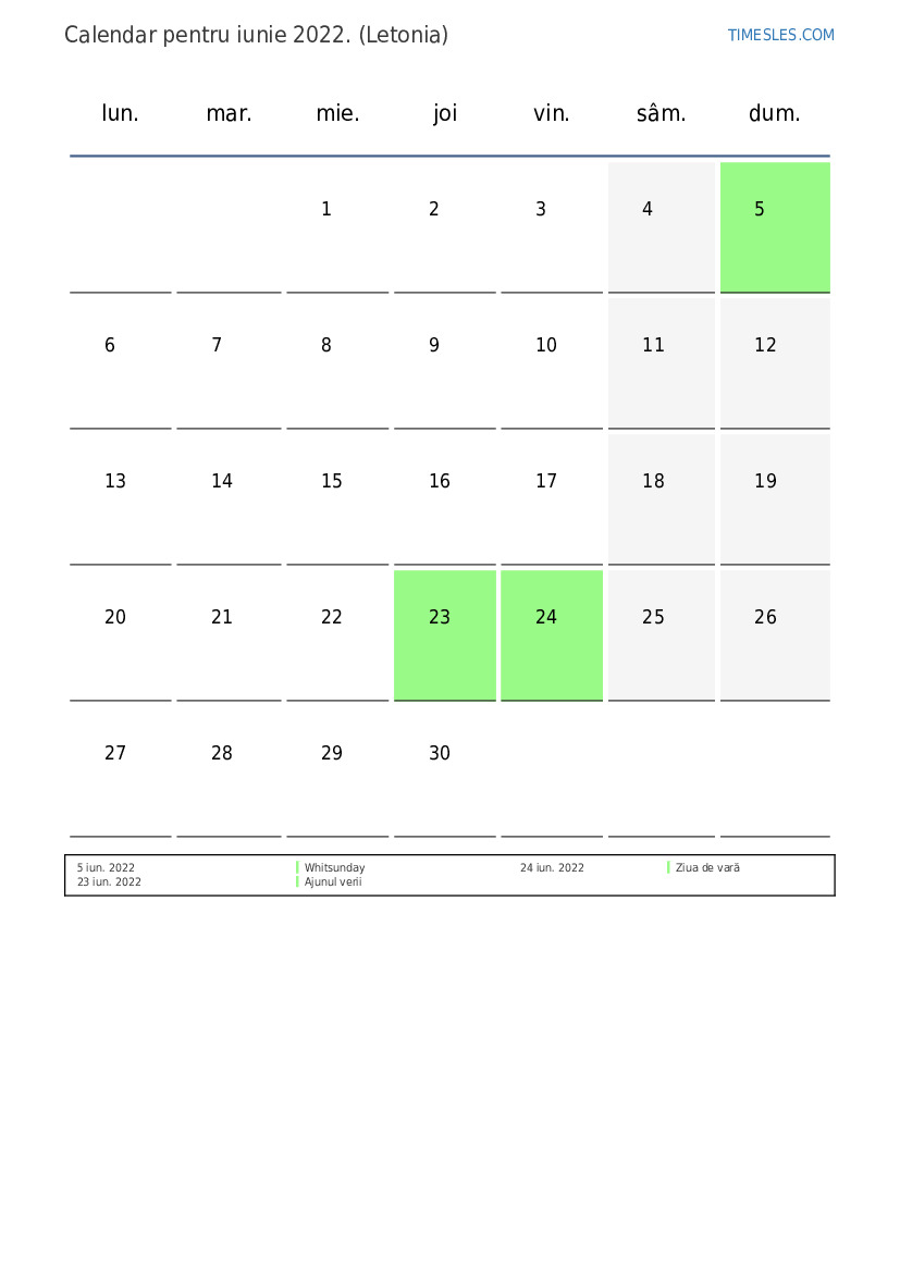 Descărcați și tipăriți calendarul PDF cu sărbătorile și weekendurile pentru iunie 2022 pentru Letonia