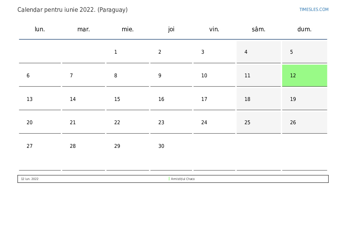 Calendarul sărbătorilor și weekendurilor pentru iunie 2022 pentru Paraguay
