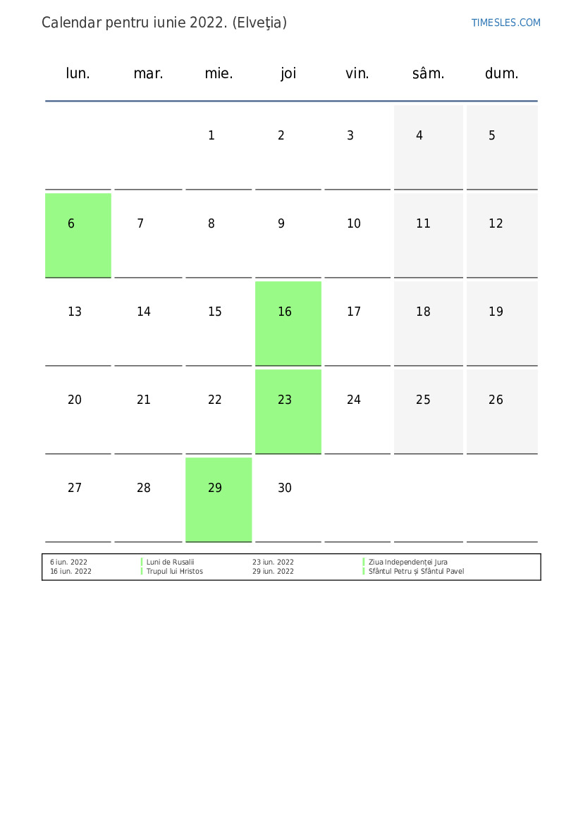 Calendarul sărbătorilor și weekendurilor pentru iunie 2022 pentru Elveția