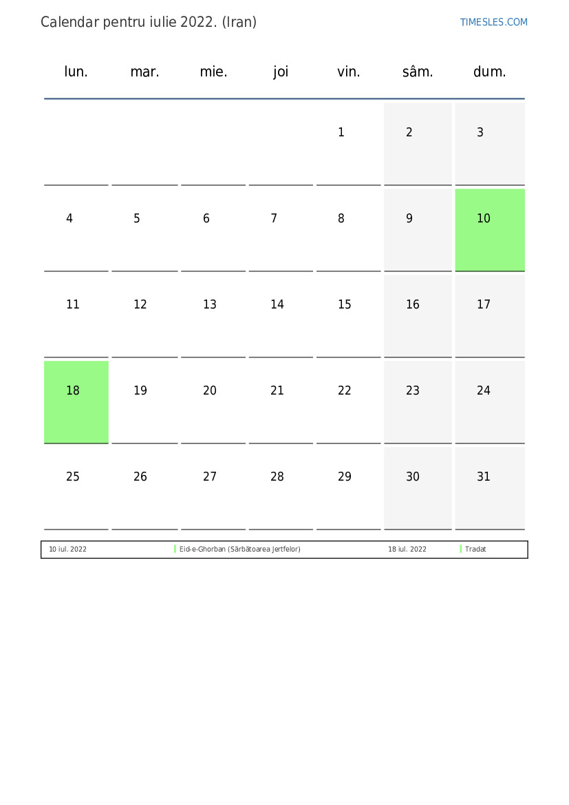 Descărcați și tipăriți calendarul PDF cu sărbătorile și weekendurile pentru iulie 2022 pentru Iran