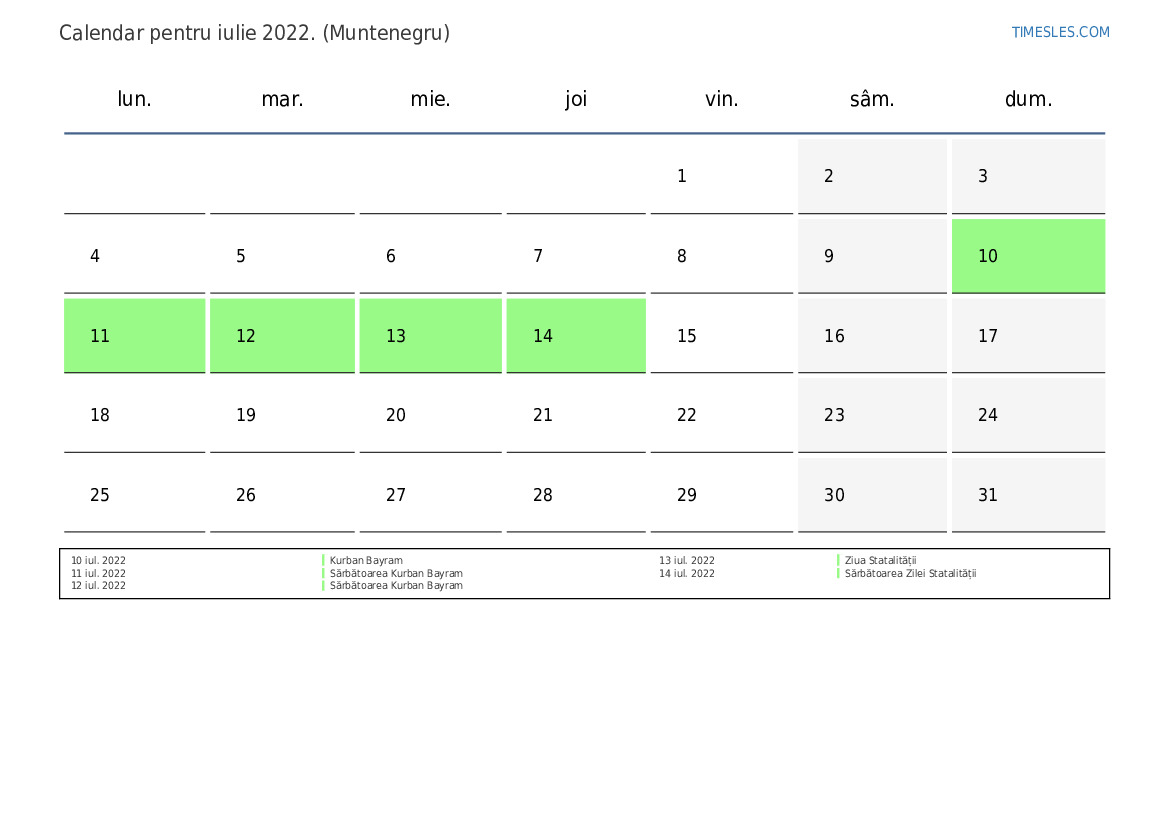 Calendarul sărbătorilor și weekendurilor pentru iulie 2022 pentru Muntenegru