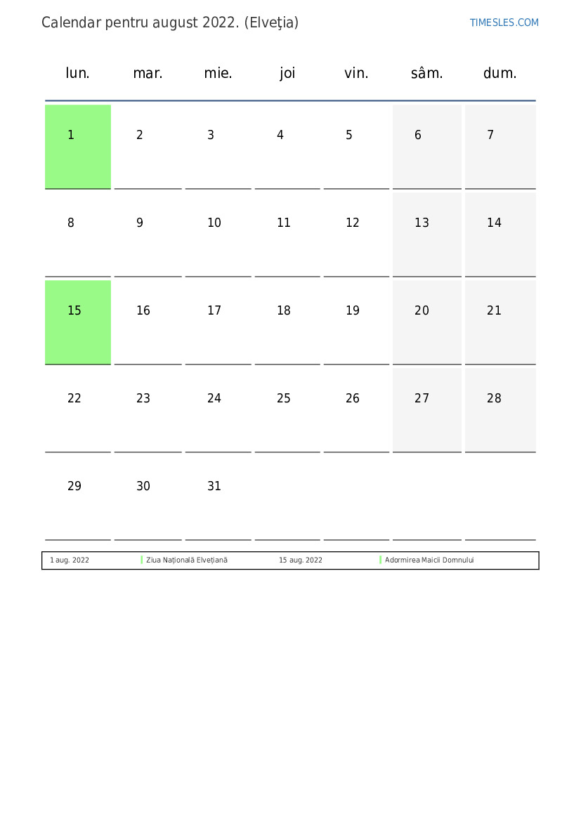 Calendarul sărbătorilor și weekendurilor pentru august 2022 pentru Elveția