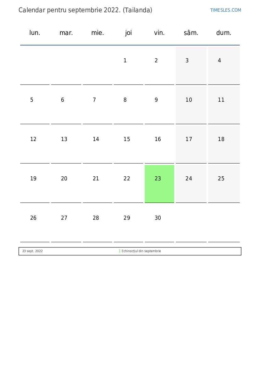 Luna septembrie conține 30 de zile. Aceasta este 9 lună din 2022. Sezonul anului: toamnă. Luna septembrie începe joia și se termină vineri. În luna septembrie 2022, sunt 1 sărbători și zile libere în Thailanda.