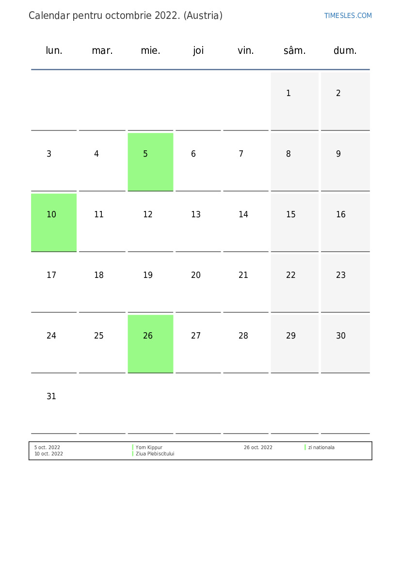 Descărcați și tipăriți calendarul PDF cu sărbătorile și weekendurile pentru octombrie 2022 pentru Austria