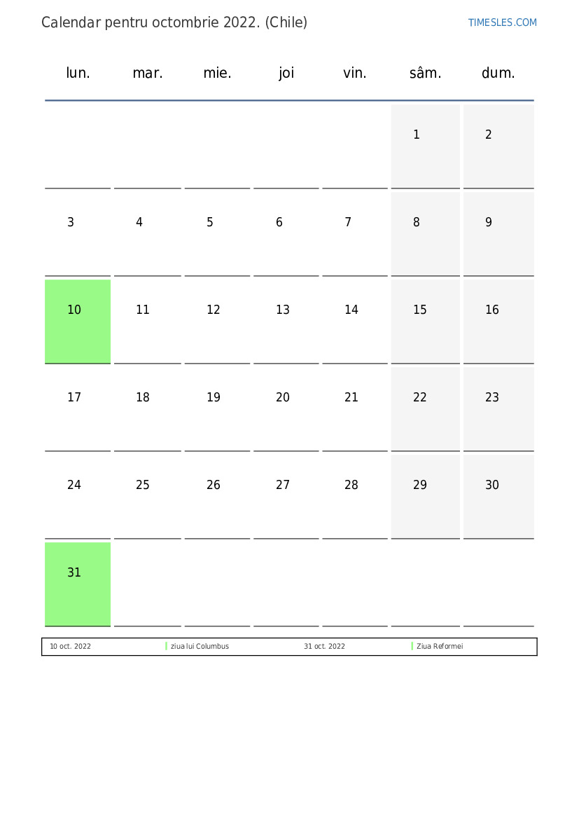 Descărcați și tipăriți calendarul PDF cu sărbătorile și weekendurile pentru octombrie 2022 pentru Chile