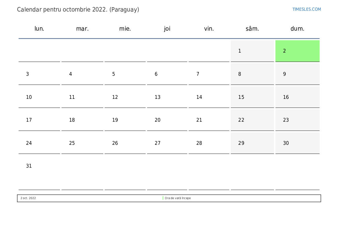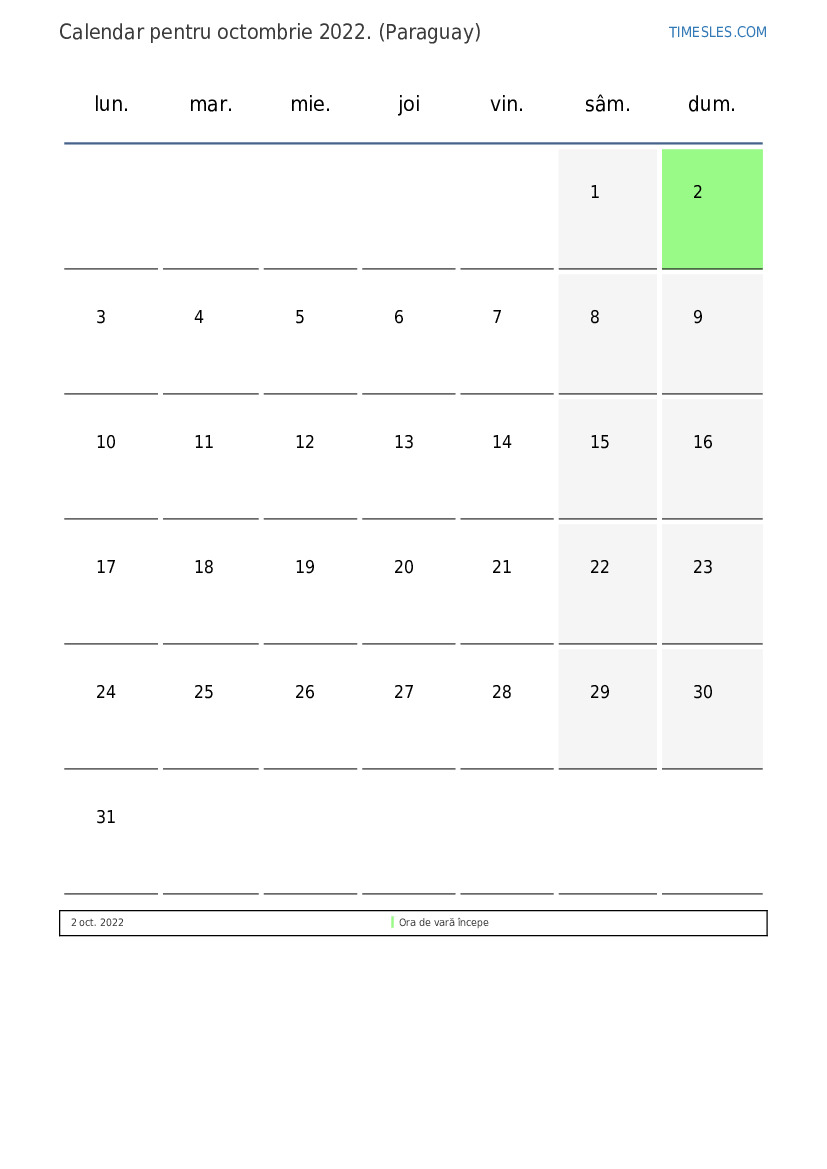 Luna octombrie conține 31 de zile. Aceasta este 10 lună din 2022. Sezonul anului: toamnă. Luna octombrie începe sâmbăta și se termină luni. În luna octombrie 2022, sunt 1 sărbători și zile libere în Paraguay.