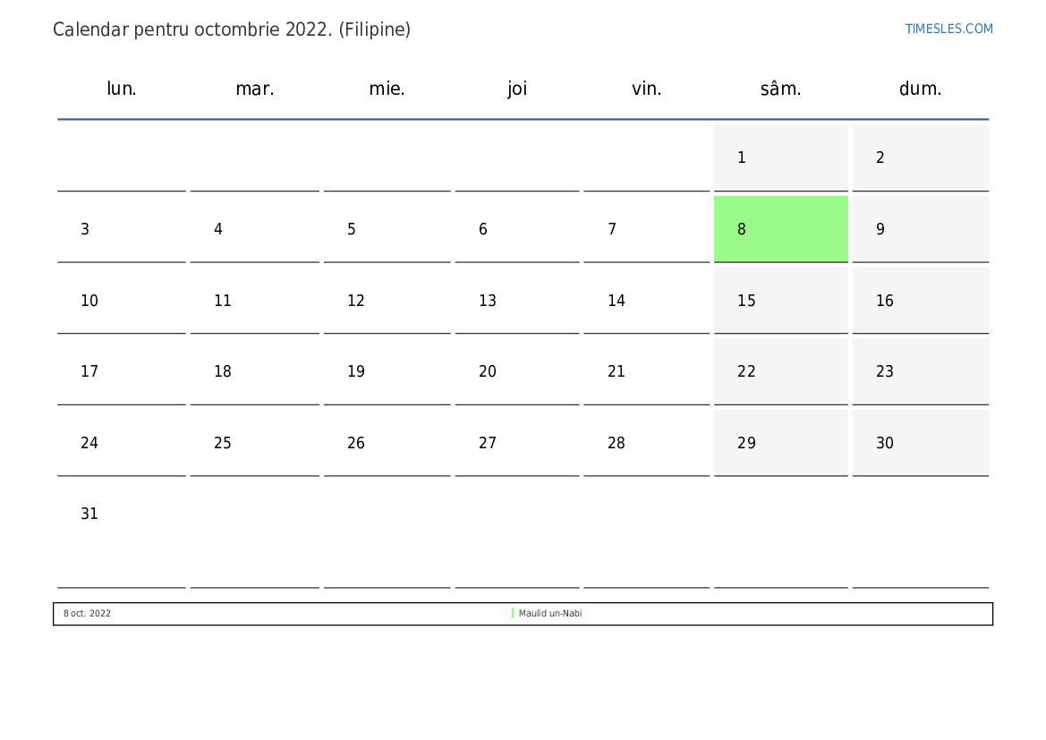 Descărcați și tipăriți calendarul PDF cu sărbătorile și weekendurile pentru octombrie 2022 pentru Filipine
