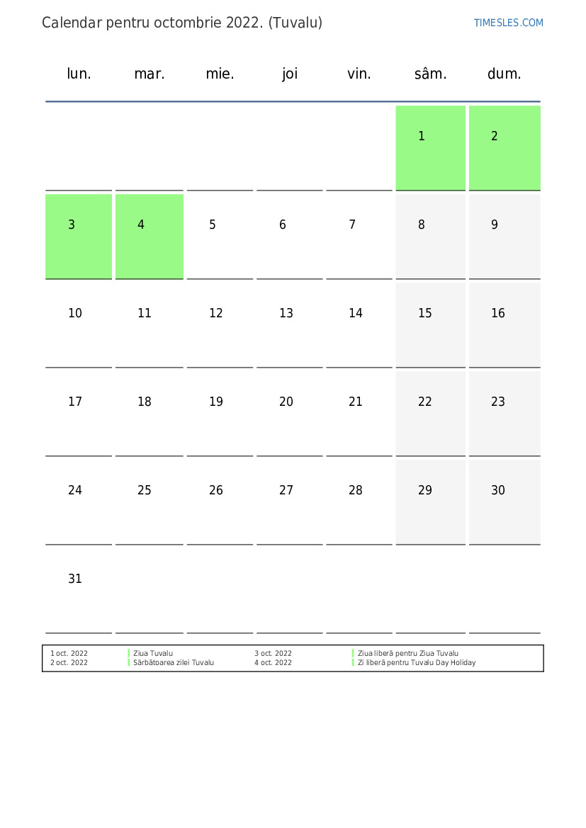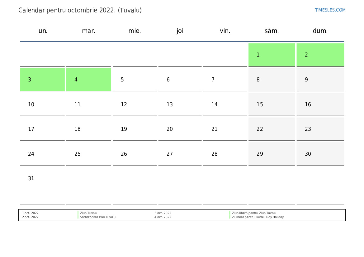 Descărcați și tipăriți calendarul PDF cu sărbătorile și weekendurile pentru octombrie 2022 pentru Tuvalu
