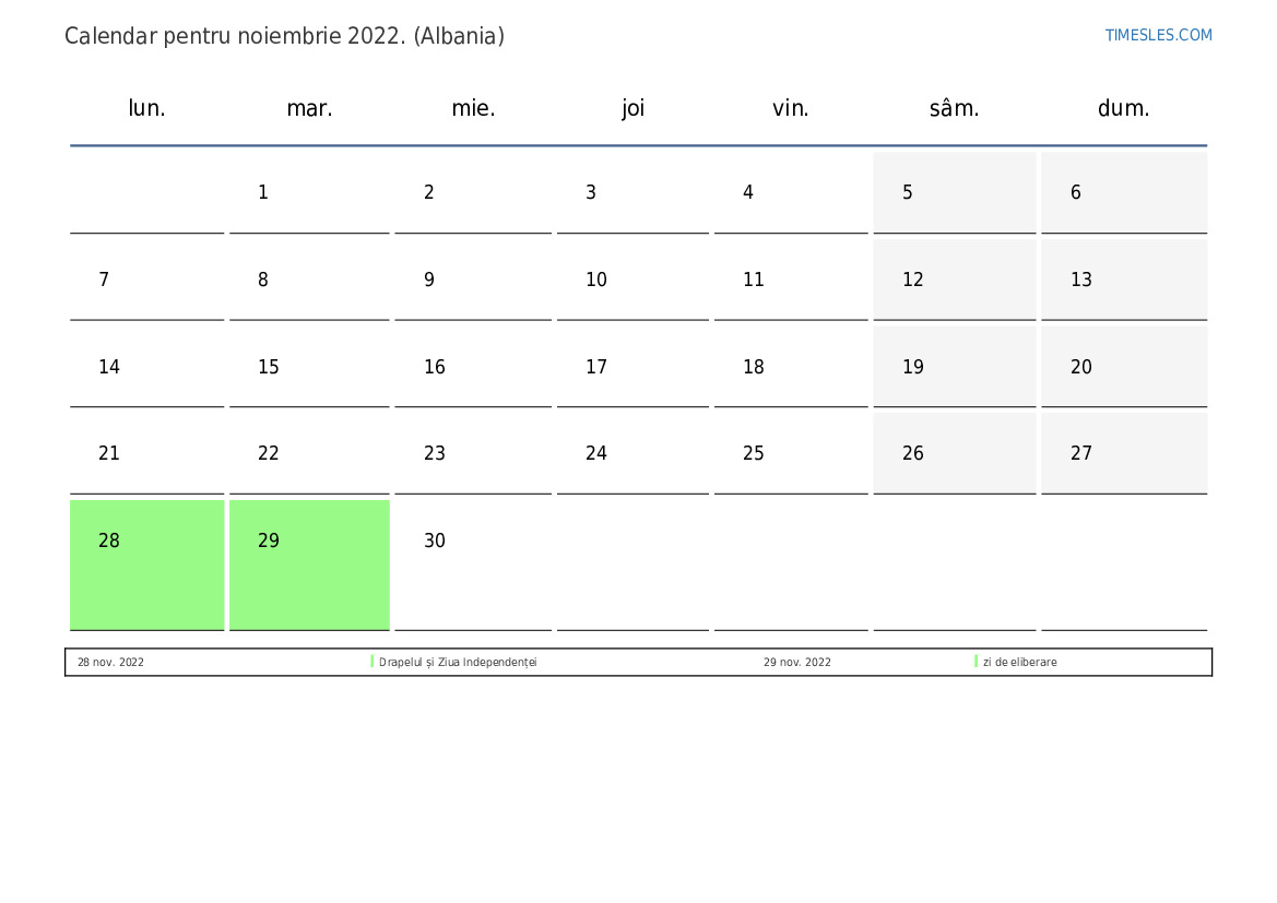 Calendarul sărbătorilor și weekendurilor pentru noiembrie 2022 pentru Albania