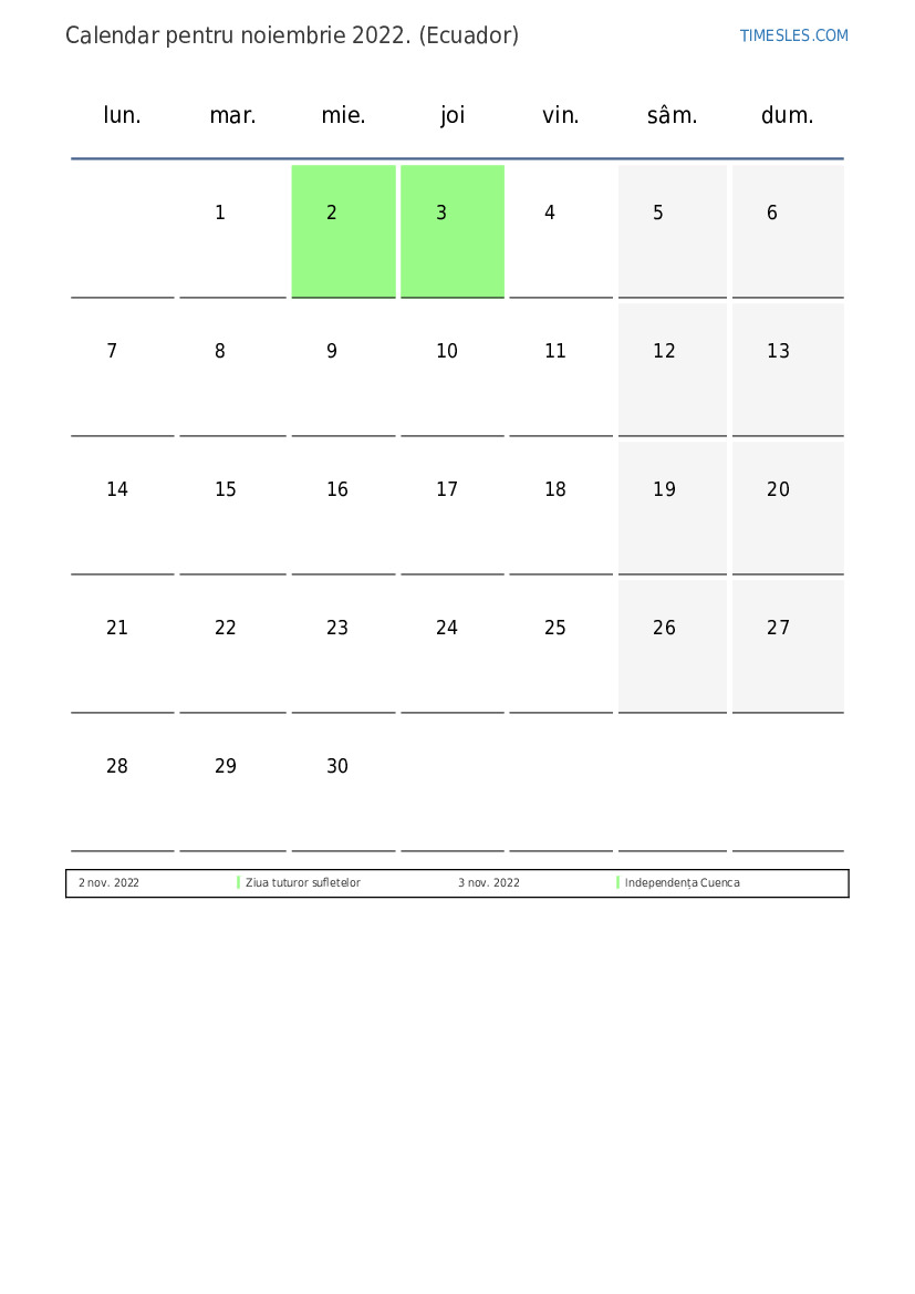 Calendarul sărbătorilor și weekendurilor pentru noiembrie 2022 pentru Ecuador