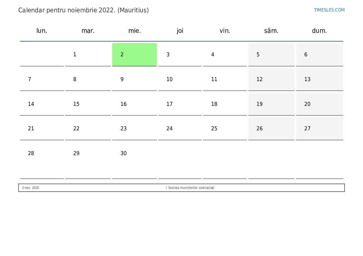 Descărcați și tipăriți calendarul PDF cu sărbătorile și weekendurile pentru noiembrie 2022 pentru Mauritius