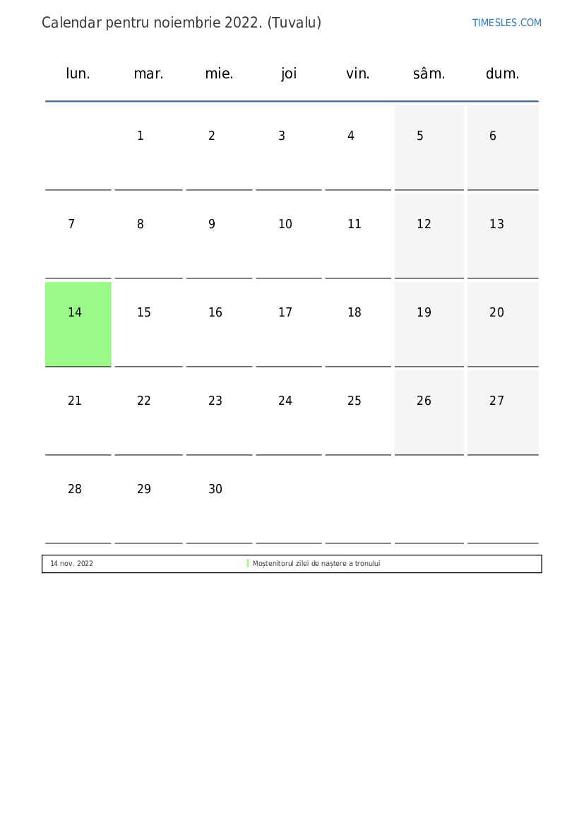 Descărcați și tipăriți calendarul PDF cu sărbătorile și weekendurile pentru noiembrie 2022 pentru Tuvalu